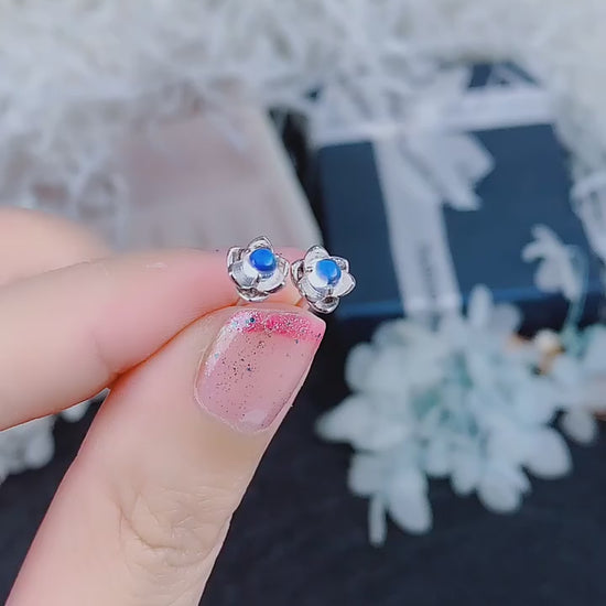 Natural Moonstone Earrings, Blue Sheen, S925 Sterling Silver, 3x3mm
