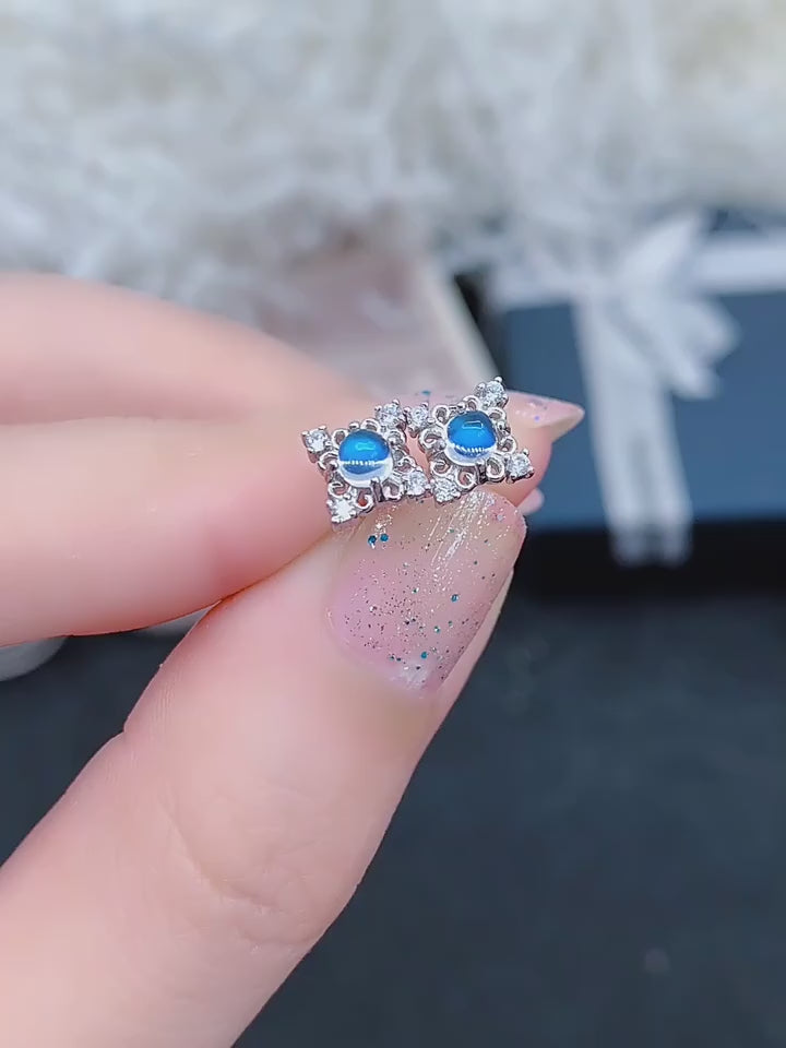 Natural Moonstone Earrings, Blue Sheen, S925 Sterling Silver, 3x3mm